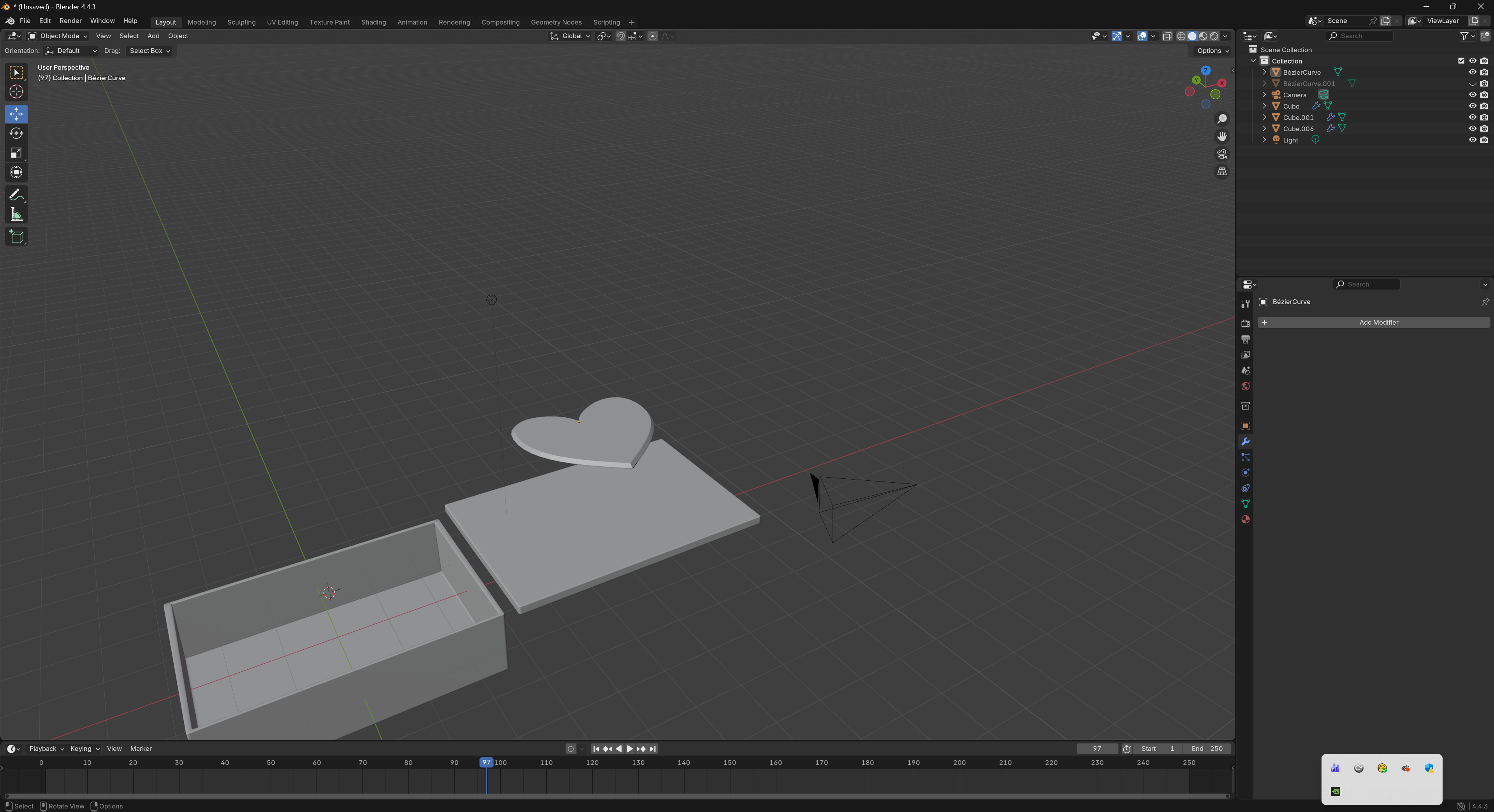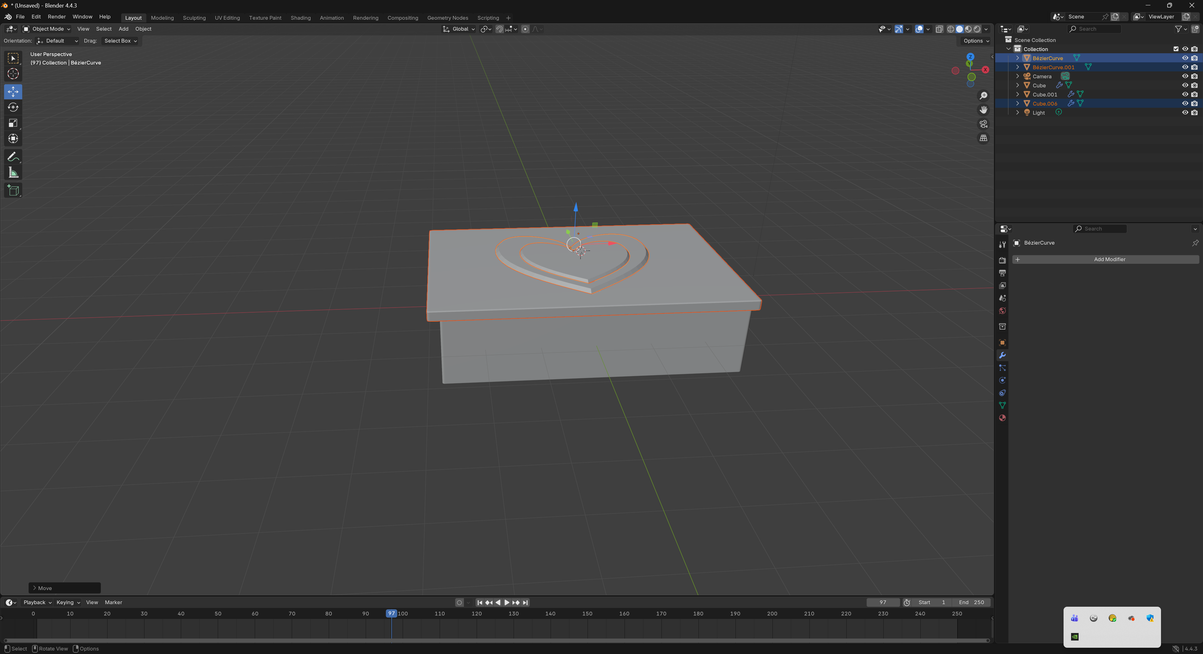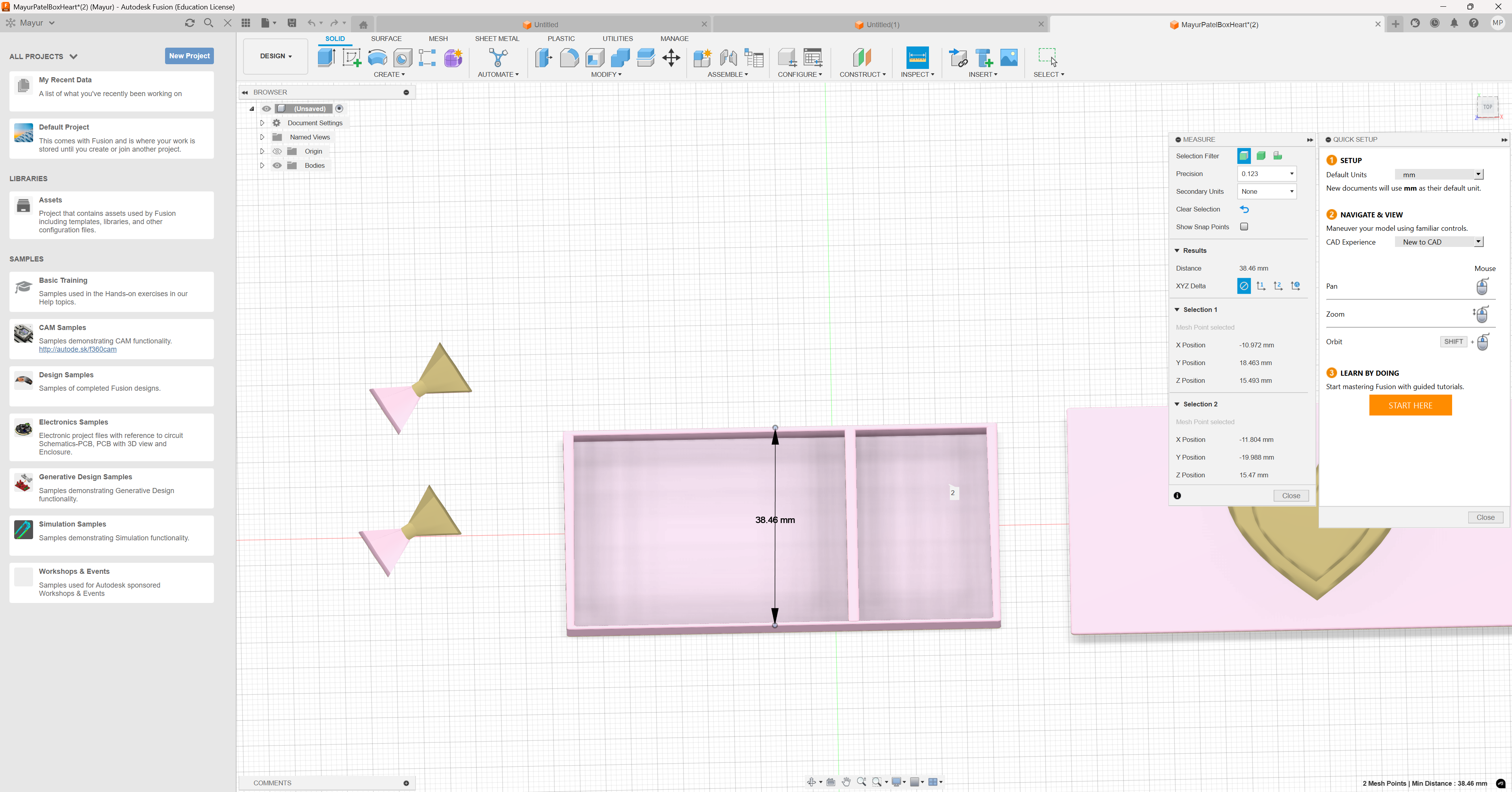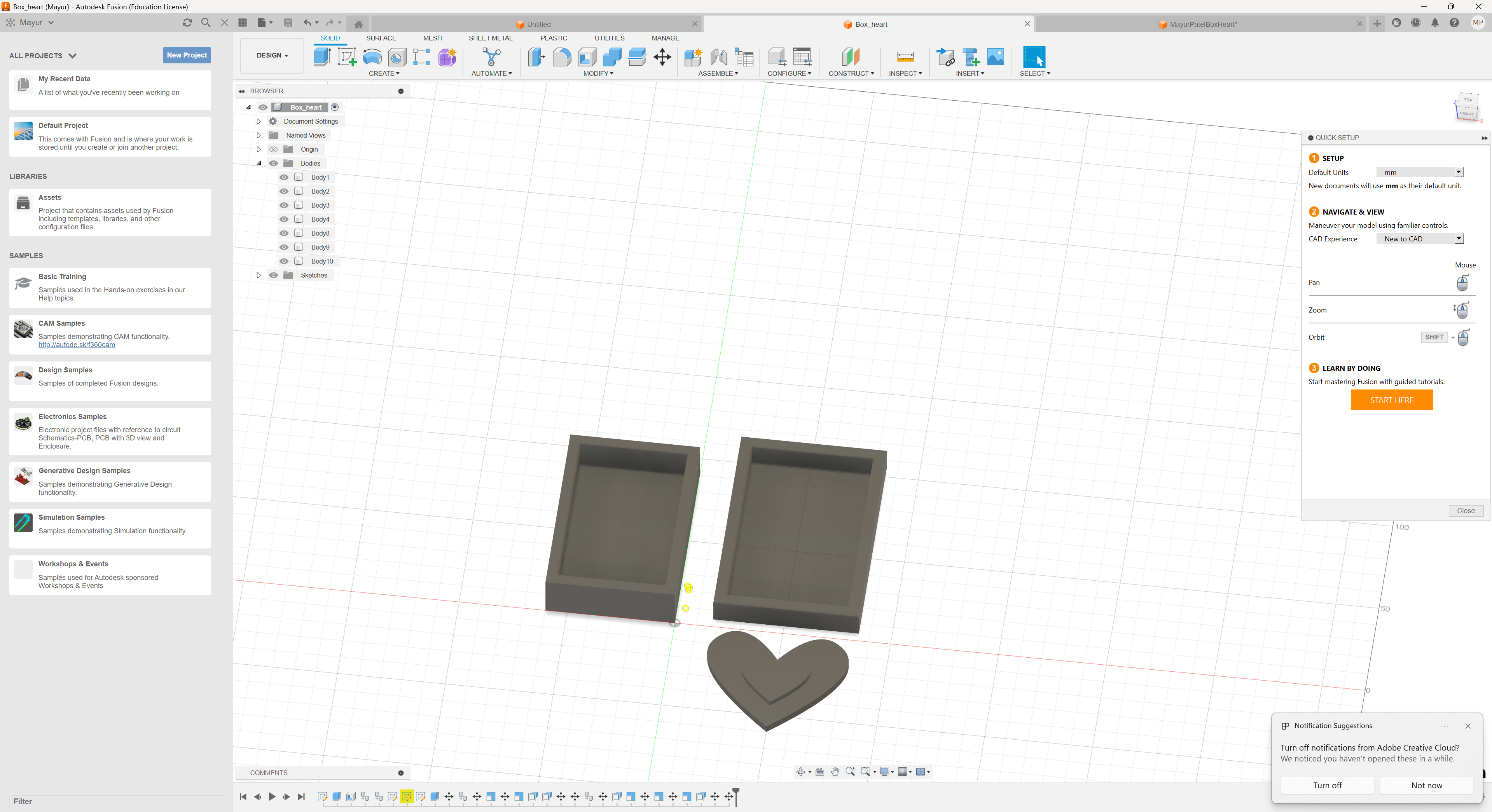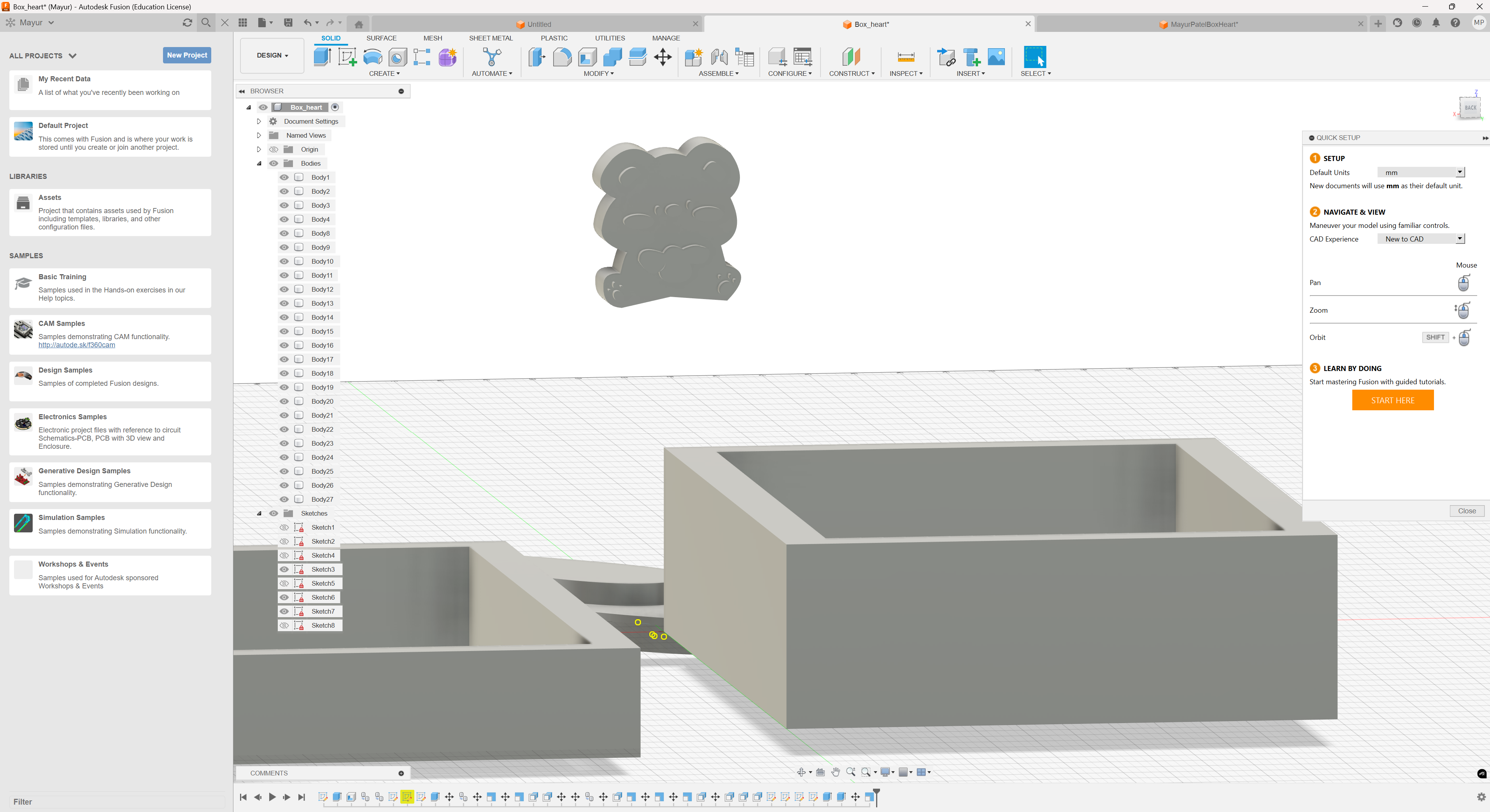 BackOn blender i added a cube, removed a face then streched it out for it to be similar sizes to the box i was looking for. I then copy pasted and made it smaller.I then made a heart, with the Curve, Bezier Tool. i added two and layered it on top one and another I then fused it together with the boxi tested out if the lid would fit onto the box, which it did i then made a bow, use a cube, delete the top, bottom and one of the faces on the side. Cut it in the center before taking the top and bottom intersection to make a bow like shapeWith the other cuts i made before, i shaped the bow so it looks better before duplicating and reflecting it. I didnt mirror it as the two things would overlap which i didnt want. i wanted for it to have a small space so i can make the center part of the bow.I then exported it as an STL and for some reason it said it was the perfect size, when it really wasnt. It ended up being horribly small so i had to sadly remake my object on FusionI quickly made a box by using the cube and extruding it and basically did the same thing like i did for Blender. On Adobe Illustrator (AI) I ended up drawing a heart and exported it as an svg file before importing it into Fusion, doing the exact same thing like on blender where i made a smaller one and made it sit on top of the bigger one. I then traced a bear, seperating the face and body.Saving the two files as an SVG, i exported it into Fusion before extruding it.I then overlapped the two things and was finally done!