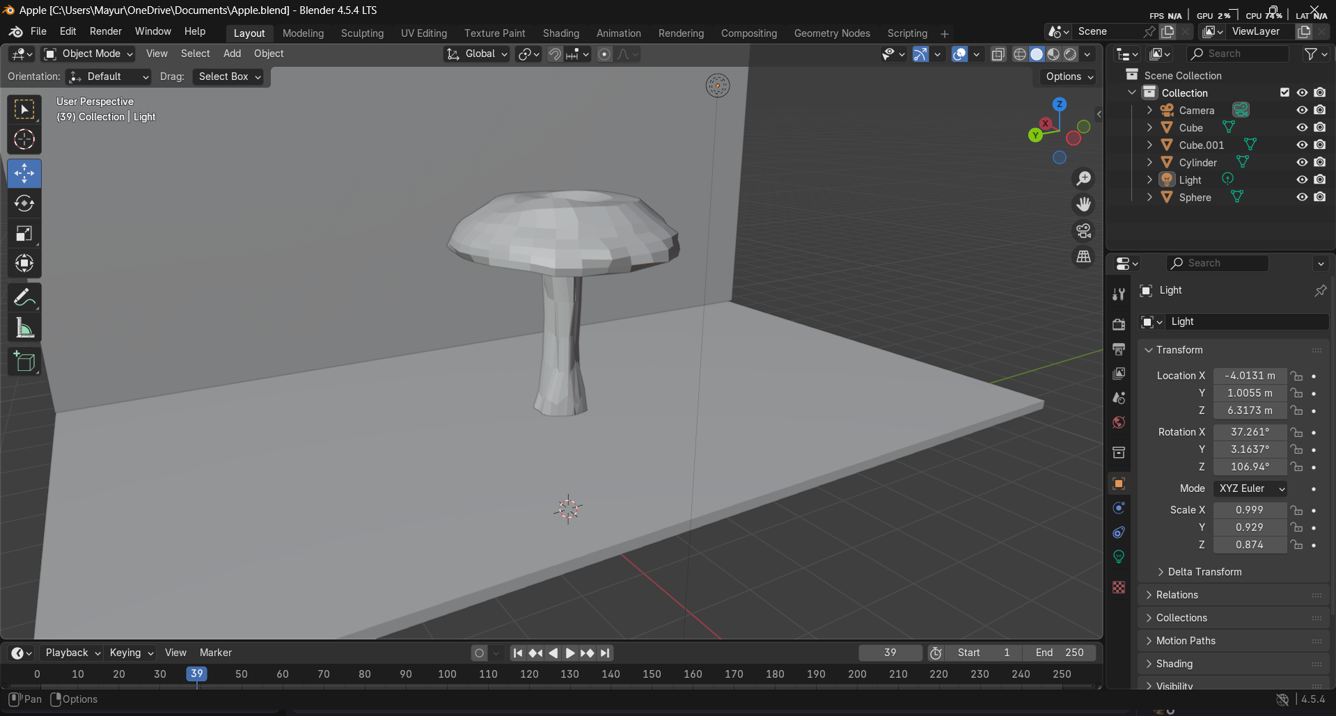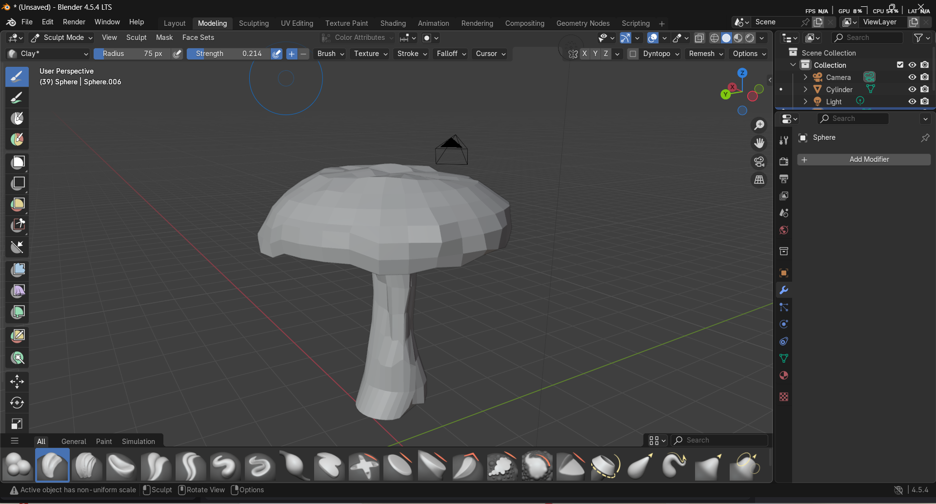 BackGrab a cylinder before reshaping some sides and use the sculpt tool to smooth things outgrab a sphere before flattening it axis and enlarge it (horizontally).with the edit mode, make slight bumps then use sculpt tool mesh contrast flattening etc...I organinally wanted to make this an eaten apple but i couldnt figure how to do the bottom part so i scrapped that idea, thats why it became a mushroomI wanted to color it and make a background for it yet it didnt work when i tried, so i sadly left it like that...Now there you have it ! A basic grey mushroom...I made a jar for this one but i didnt use the sculpt tool that much, mainly the edit tool alongside with the cuts.I basically just kept on cutting it and resizing it before i was satisfied with the shape.I then grabbed a sphere before flattening it and making it into that shape by flattening it.I did sculpt some parts, to smooth out the edges of the jar that we could see and that was it!