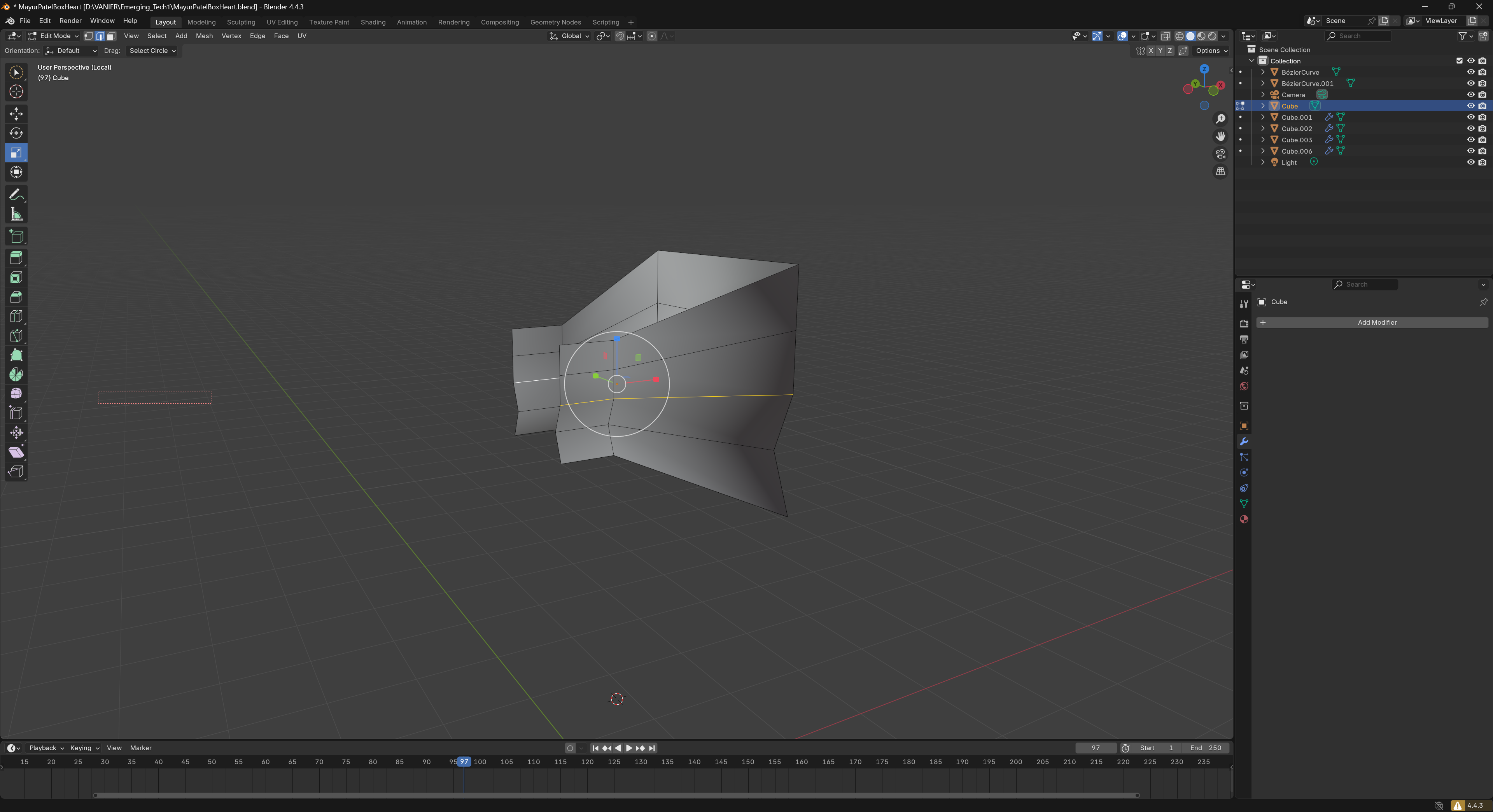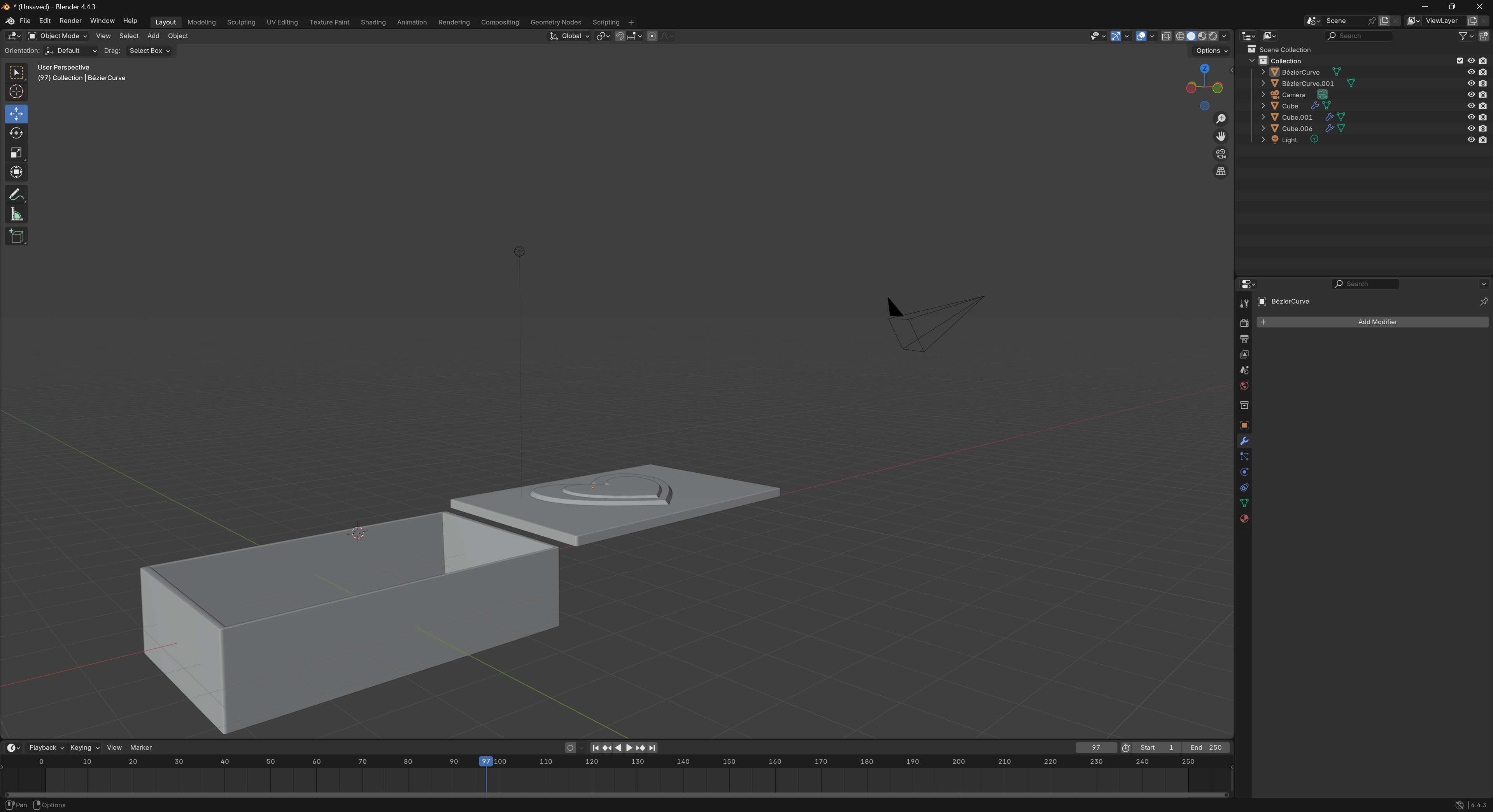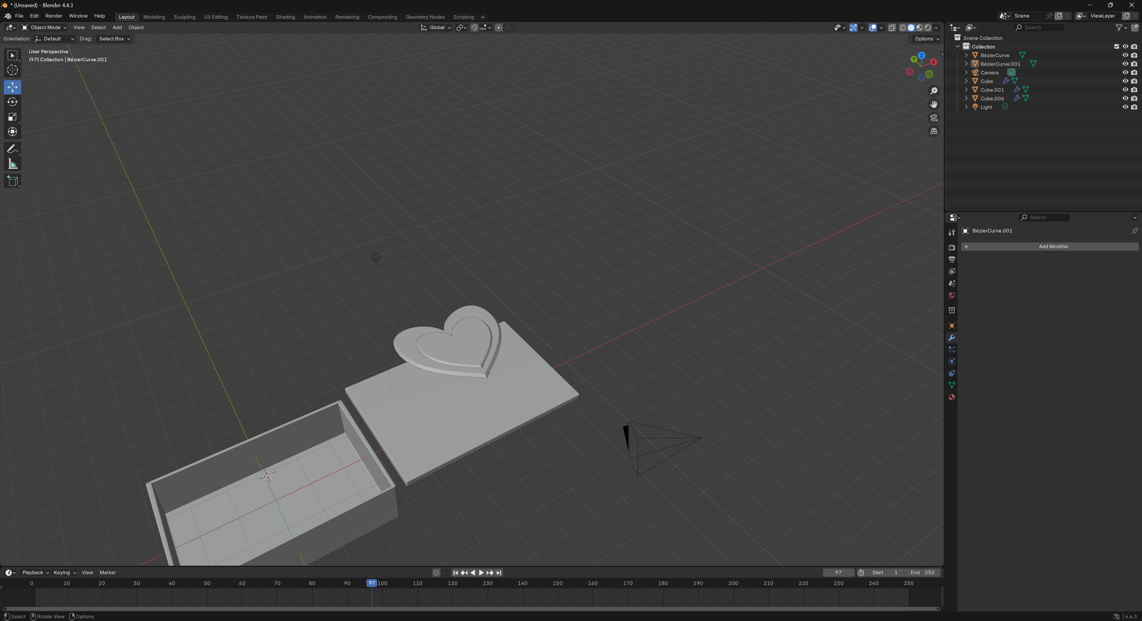 BackOn blender i added a cube, removed a face then streched it out for it to be similar sizes to the box i was looking for. I then copy pasted and made it smaller.I then made a heart, with the Curve, Bezier Tool. i added two and layered it on top one and another I then fused it together with the boxi tested out if the lid would fit onto the box, which it did i then made a bow, use a cube, delete the top, bottom and one of the faces on the side. Cut it in the center before taking the top and bottom intersection to make a bow like shapeWith the other cuts i made before, i shaped the bow so it looks better before duplicating and reflecting it. I didnt mirror it as the two things would overlap which i didnt want. i wanted for it to have a small space so i can make the center part of the bow.I then exported it as an STL and for some reason it said it was the perfect size, when it really wasnt. It ended up being horribly small so i had to sadly remake my object on FusionI quickly made a box by using the cube and extruding it and basically did the same thing like i did for Blender. On Adobe Illustrator (AI) I ended up drawing a heart and exported it as an svg file before importing it into Fusion, doing the exact same thing like on blender where i made a smaller one and made it sit on top of the bigger one. I then traced a bear, seperating the face and body.Saving the two files as an SVG, i exported it into Fusion before extruding it.I then overlapped the two things and was finally done!
