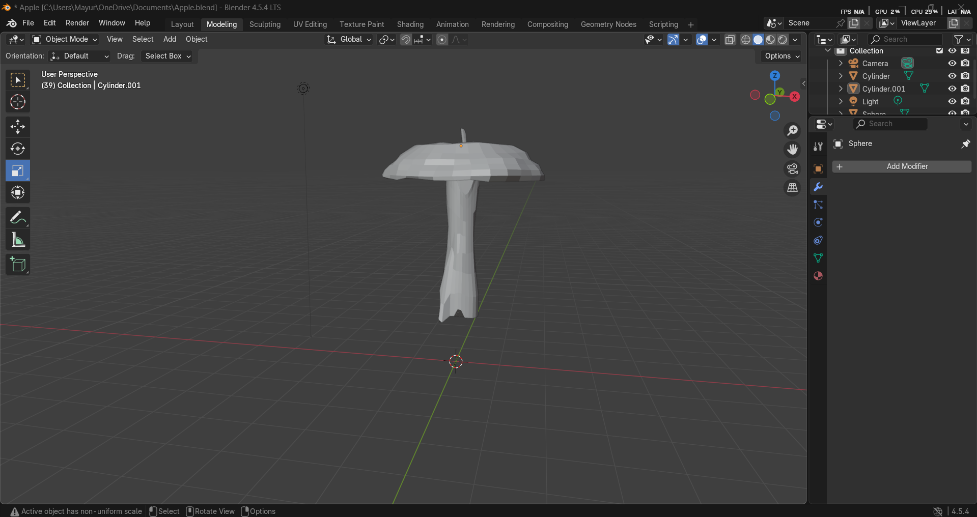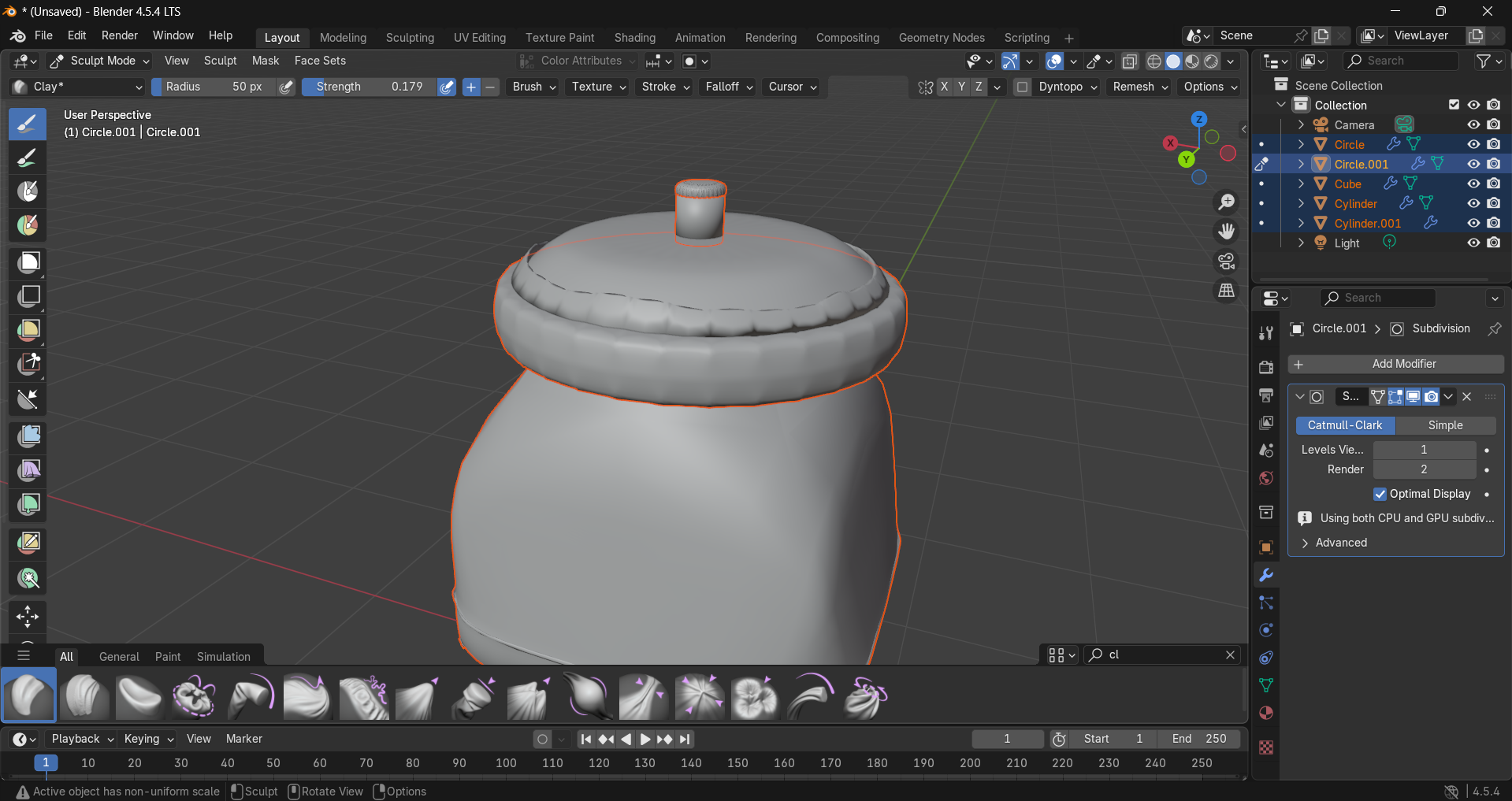 BackGrab a cylinder before reshaping some sides and use the sculpt tool to smooth things outgrab a sphere before flattening it axis and enlarge it (horizontally).with the edit mode, make slight bumps then use sculpt tool mesh contrast flattening etc...I organinally wanted to make this an eaten apple but i couldnt figure how to do the bottom part so i scrapped that idea, thats why it became a mushroomI wanted to color it and make a background for it yet it didnt work when i tried, so i sadly left it like that...Now there you have it ! A basic grey mushroom...I made a jar for this one but i didnt use the sculpt tool that much, mainly the edit tool alongside with the cuts.I basically just kept on cutting it and resizing it before i was satisfied with the shape.I then grabbed a sphere before flattening it and making it into that shape by flattening it.I did sculpt some parts, to smooth out the edges of the jar that we could see and that was it!